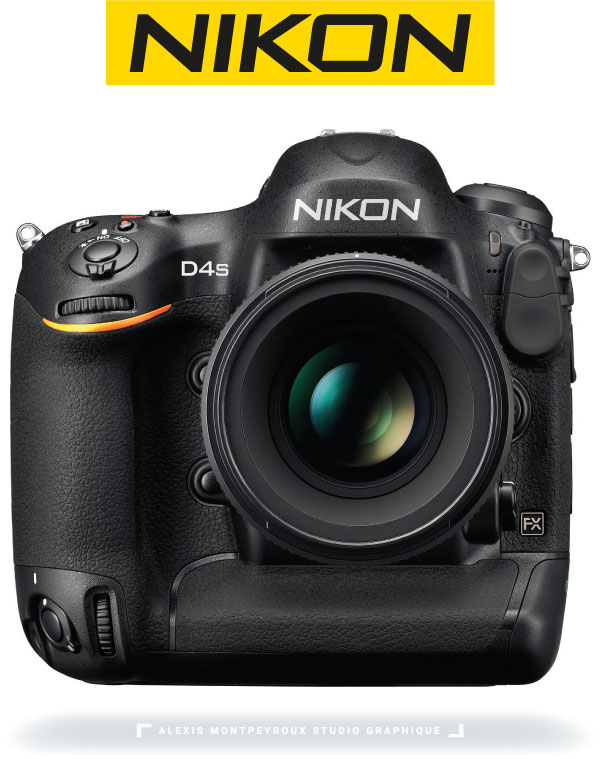 Le projet présenté donne sa place à la couleur jaune sur le boîtier, associée à un nouveau logo moins massif, plus technique, intégrant le symbole d’une image / vignette photo dans sa lettre O, le tout avec un italique moins prononcé que sur le logo actuel. Le numéro du modèle, ici D4s abandonne son caractère serif outline au léger look « western » au profit d’une lettre plus lisible et plus carrée, pleine, sans-serif extended dans l’esprit « Eurostile », plus proche du style du logo proposé, technique et contemporaine.